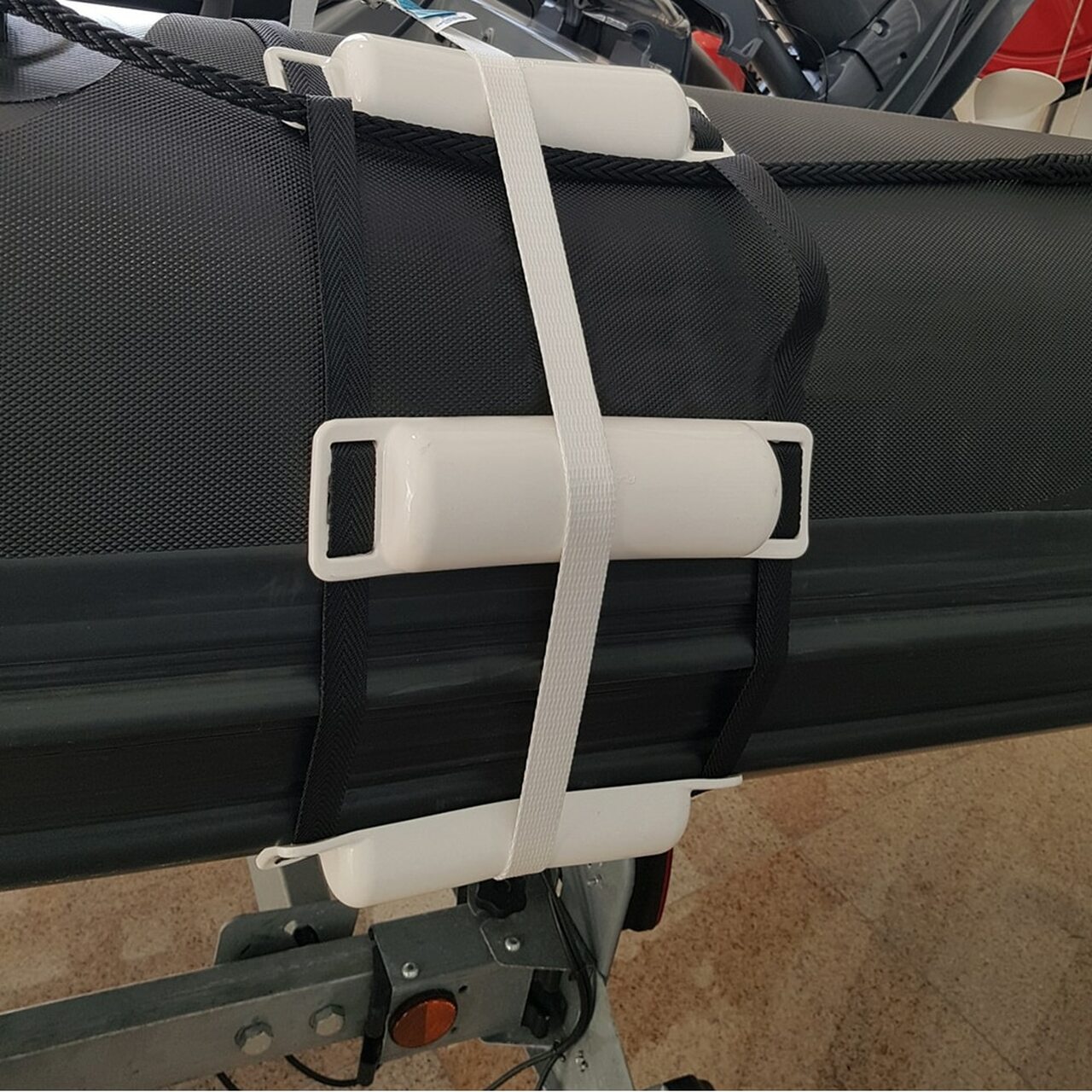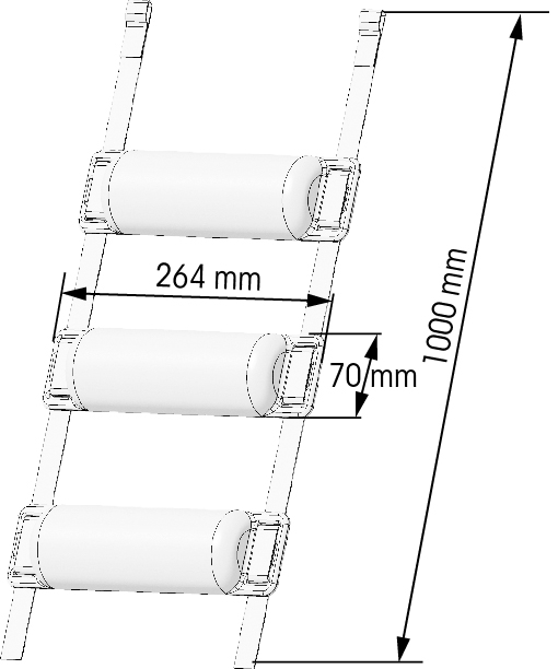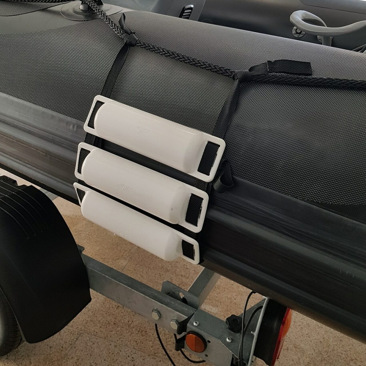 Clever combination of 3 small half-moon shaped fenders, positioned along a 1 m long webbing strap with a loop at all 4 ends.