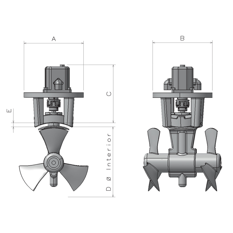 | Code | Thrust | Propellers | Power | Weight | A | B | C | D | E |